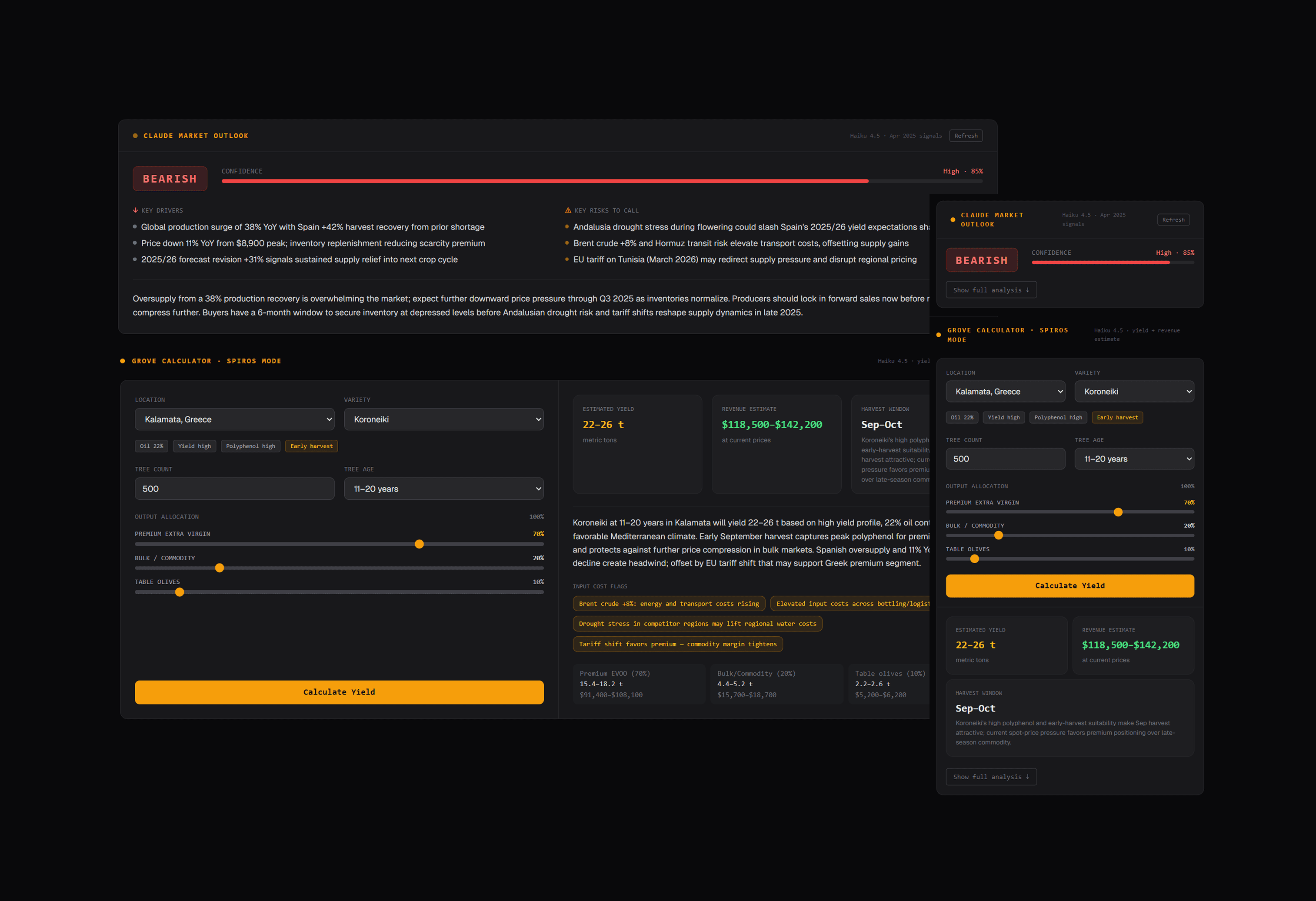 Claude takes those inputs alongside current market conditions and returns a yield range, revenue estimate, harvest timing recommendation, and input cost flags drawn from live ticker events. The output is specific to Spiros's grove, not generic to all producers.